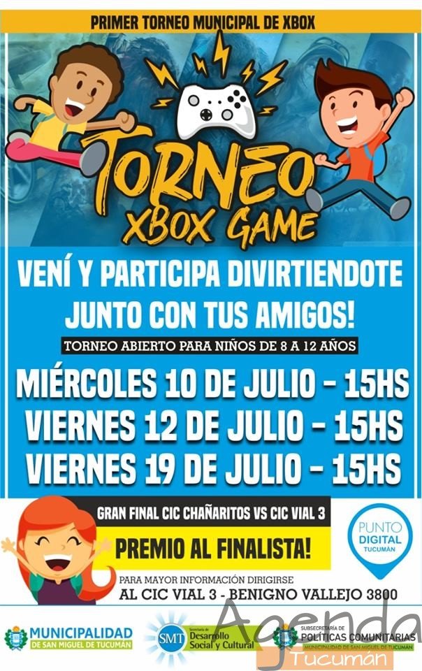 En estas vacaciones de invierno, invitan a los niños de 8 a 12 años a participar del primer torneo de juegos virtuales “Xbox Game”, organizado por la Secretaría de Políticas Comunitarias. El evento se realizará simultáneamente en los Centros Integradores comunitarios (CIC) “Vial III”, ubicado en calle Benigno Vallejo al 3.800, y “Los Chañaritos”, sito en avenida Alem al 3.800. Los ganadores de la competencia recibirán importantes premios. Para más información e inscripciones, los interesados deben dirigirse a esos Centros, que dependen del municipio de la Capital.
