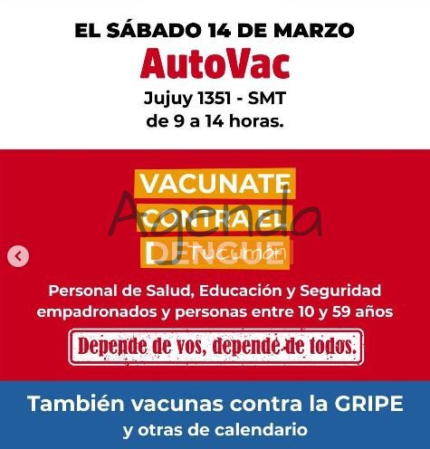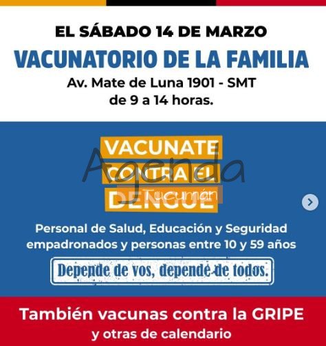 Este sábado 14 de marzo, el Ministerio de Salud Pública de Tucumán, llevará adelante una nueva jornada de vacunación gratuita destinada a prevenir dos enfermedades estacionales: la gripe y el dengue. La actividad, se desarrollará de 9 a 14 horas en el Vacunatorio de la Familia de Avenida Mate de Luna 1901 y en el AutoVac ubicado en Jujuy 1351, San Miguel de Tucumán.