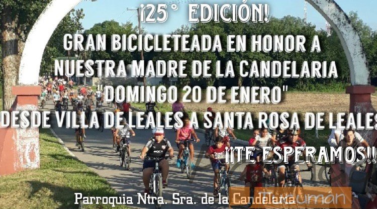 En honor a Nuestra Madre de la Candelaria, el 20 de enero a partir de 17:00 se desarrollará la 25º Edición de la Gran Bicicleteada en Leales, un evento no competitivo ideal para toda la familia. Las inscripciones se realizan en la Parroquia de Villa de Leales y tiene un valor de 20 pesos.