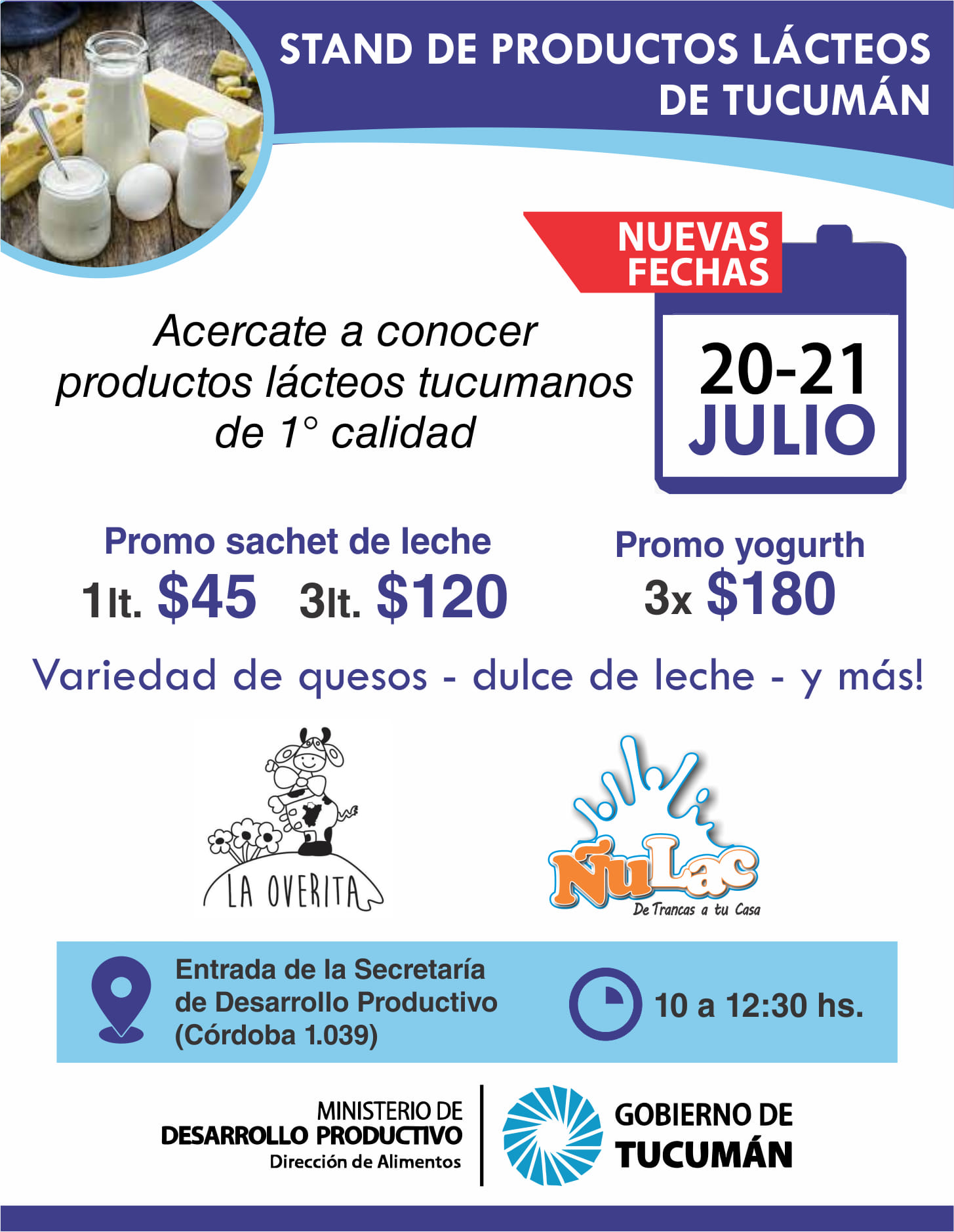 Los productos de las marcas tucumanas Ñulac, La Overita y La Fábrica podrán conseguirse este martes 20 y miércoles 21, de 10 a 12:30, en la sede de la Dirección de Alimentos de la Provincia, en calle Córdoba 1.039. Allí los vecinos encontrarán leche, yogurt y una amplia variedad de quesos a precios accesibles.