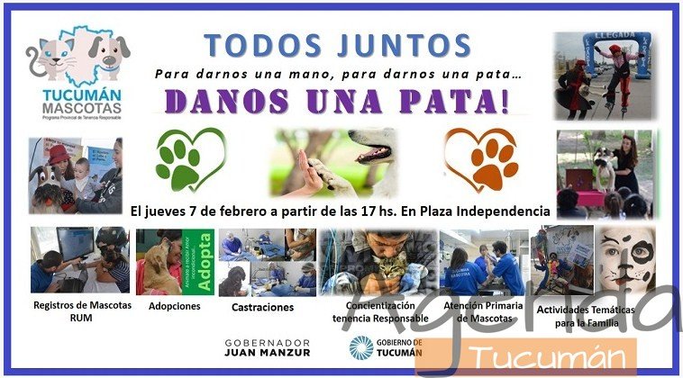 El jueves 7 de febrero de 17 a 20 en Plaza Independencia, el Programa Tucumán Mascotas realizará “Danos una pata”, un evento para concientizar sobre el cuidado de animales.