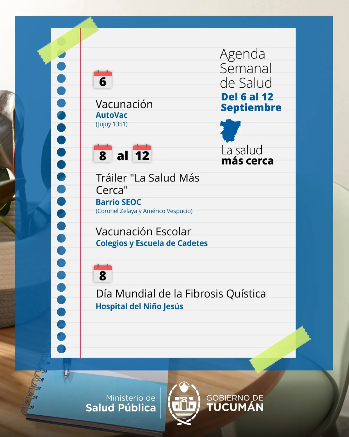 * Agenda Sanitaria: El Ministerio de Salud de Tucumán recuerda que hasta el viernes 12 de septiembre, se llevarána a cabo un serie de jornadas y actividades destinadas a facilitar la atención de los habitantes de la provincia