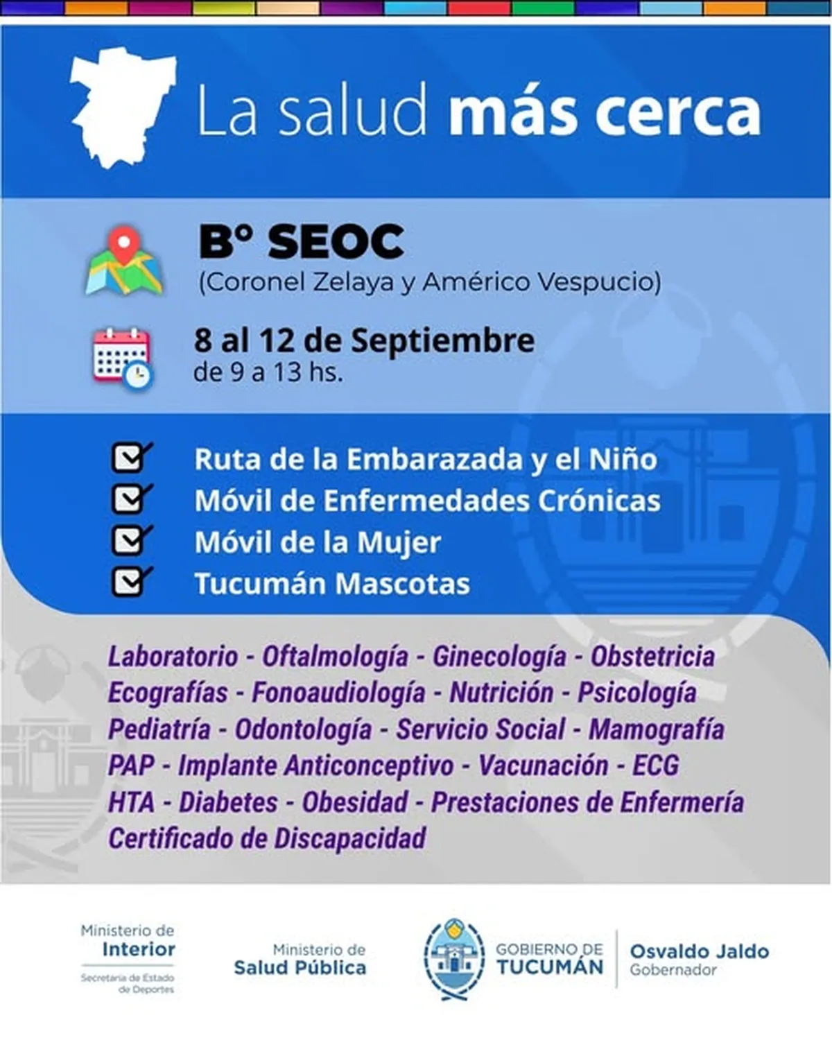 Hasta el viernes 12 de septiembre, los móviles de ‘La Salud Más Cerca’ (de la Mujer, de la Embarazada, de Enfermedades Crónicas y el Operativo Tucumán Mascotas del Ministerio de Salud Pública) estarán en Bº SEOC (Coronel Zelaya y Av Américo Vespucio) de 9 a 13. Se ofrecerán estudios de laboratorio, ginecología, pediatría, odontología, ecografías, castraciones de mascotas y más.
