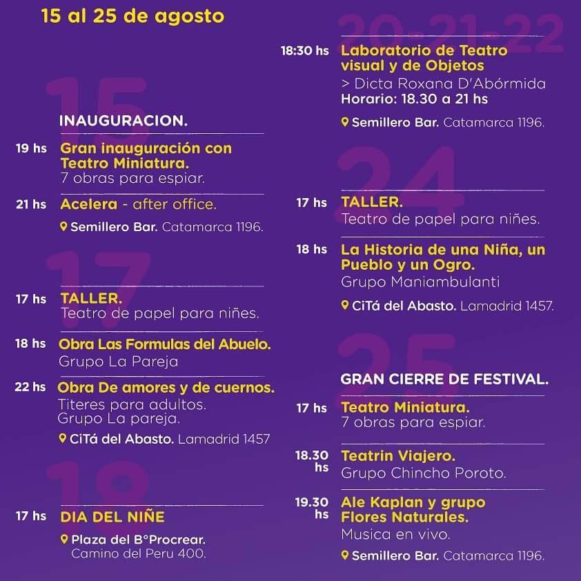El anfiteatro de El Cadillal se prepara para disfrutar tres días con los más pequeños. Desde el sábado 17 hasta el lunes 19 de agosto desde las 16 se podrá disfrutar de: Food trucks; juegos, maquillaje artístico, juegos; hormiguero gigante y la Feria lagoferiantes. El domingo 18 se presentará el espectáculo de Brenda Show.