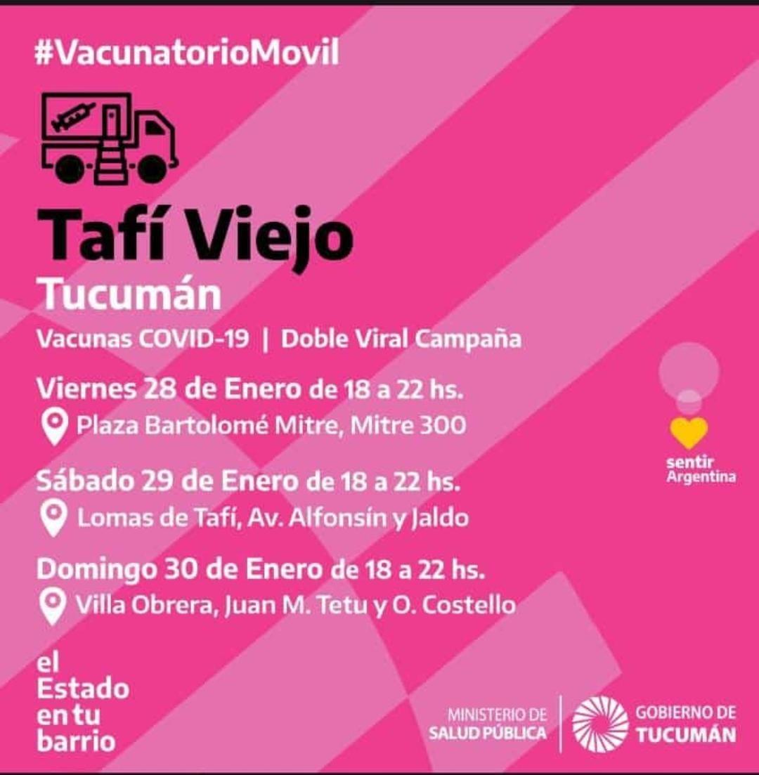 El camión vacunatorio del ministerio de Salud estará este fin de semana en Tafí Viejo para inmunizar contra el coronavirus y aplicar otras vacunas del calendario nacional.