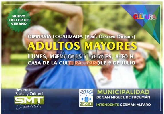 Los adultos mayores podrán participar del nuevo taller de gimnasia localizada, zumba y cuarteto, que se dictará desde la próxima semana en la Casa de la Cultura de la Municipalidad de San Miguel de Tucumán, ubicada a la altura de avenida Gobernador del Campo y Soldati, en el parque 9 de Julio.