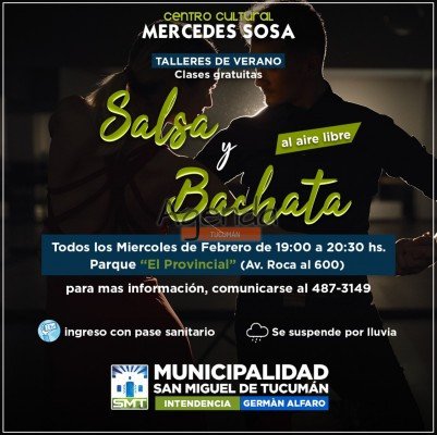 A partir de esta semana, todos los miércoles de febrero, de 19 a 20.30, la Municipalidad de San Miguel de Tucumán ofrecerá clases gratuitas de salsa y bachata en el parque El Provincial, en la cuadra de la ex estación del ferrocarril, ubicada en avenida Roca al 600.