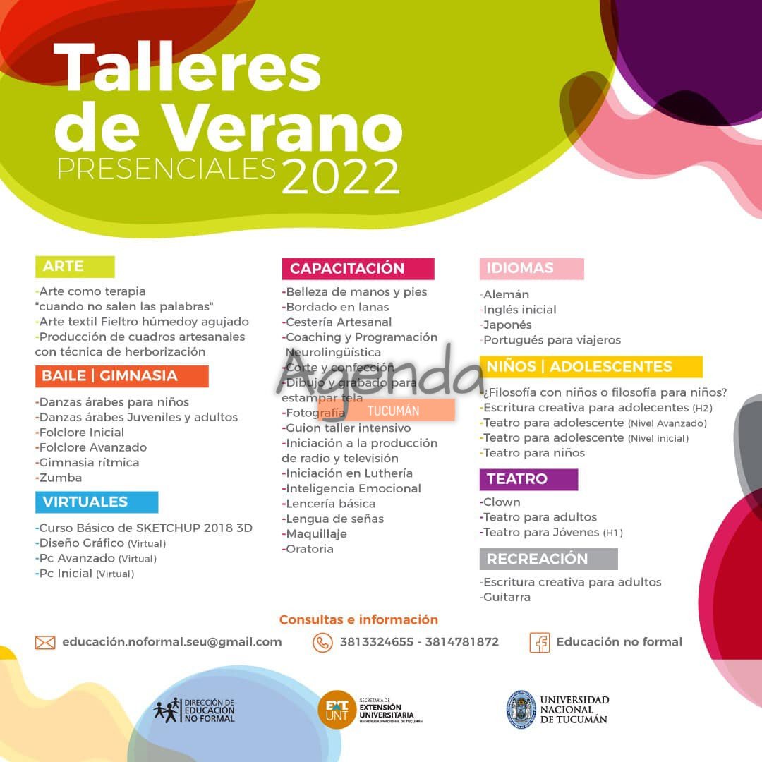 Desde la Fan Page (Facebook) de la Secretaría de Extensión de la UNT, publicaron el lanzamiento de los Talleres de Verano 2022, que darán inicio el 10 de enero del año próximo. Se llevarán a cabo en modalidad presencial, y se dictarán en la sede del programa Educación Permanente para Adultos Mayores (EPAM), y en el Centro Cultural Eugenio F. Virla.