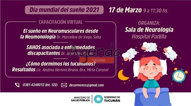 En el marco del Día Mundial del Sueño, que se celebra el 19 de marzo, se realizará una capacitación virtual el 17 de marzo, de 9 a 11:30 horas, organizada por la Unidad de Sueño, la Sala de Neurología, a cargo de Alejandra Molteni, junto aMartín Maldonado y con la División de Informática, a cargo de Gerardo Andrada, del hospital Padilla. La jefa de la Unidad Respiratoria, Sueño y Ventilación No invasiva del hospital Padilla, Mirta Azucena Coronel, contó que se llamó a un especialista de Salta que participará como parte del NOA y que hablará sobre los problemas de sueño que tienen algunos pacientes con enfermedades neuromusculares, que son aquellas que afectan la parte neurológica y secundariamente a los músculos.